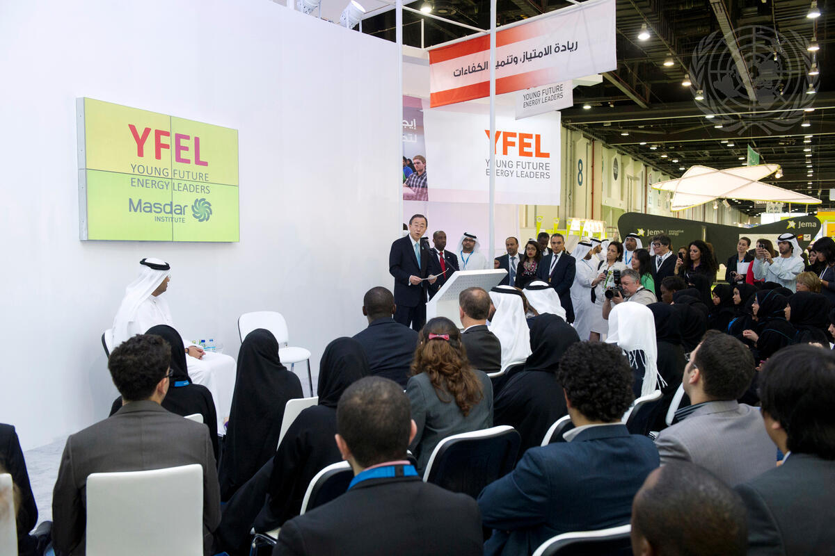Secretary-General Ban Ki-moon (at podium) addresses participants of the “Young Future Energy Leaders” meeting, held on the margins of the 4th World Future Energy Summit in Abu Dhabi, United Arab Emirates.