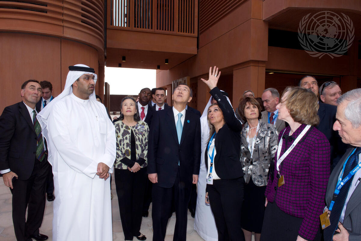 Secretary-General Ban Ki-moon (centre, blue tie) and his wife, Yoo Soon-taek (left of Mr. Ban), visit Masdar City, an environmentally sustainable, carbon-neutral development in the United Arab Emirates (U.A.E.)’s capital, Abu Dhabi. Mr. Ban travelled to the U.A.E. to attend the 4th World Future Energy Summit.
