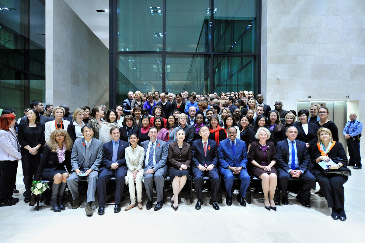 Secretary-General Ban Ki-moon (front, fifth from right) and his wife, Yoo Soon-taek (left of Mr. Ban), pose for a group photo with staff members of the Joint United Nations Programme on HIV/AIDS (UNAIDS), including UNAIDS Executive Director Michel Sidibé (right of Mr. Ban) in Geneva, Switzerland. Also pictured are Kim Won-soo (front, second from left), Mr. Ban’s Deputy Chef de Cabinet, and Robert Orr (front, third from left), Assistant Secretary-General for Policy Planning.