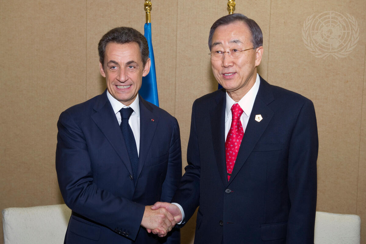 Secretary-General Ban Ki-moon (right) meets with Nicolas Sarkozy, President of France, during the African Union Summit in Addis Ababa.