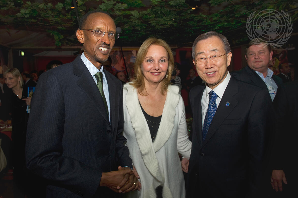 Secretary-General Ban Ki-moon (front, right) poses for a photograph with Paul Kagame (left), President of the Republic of Rwanda, and Josette Sheeran, Executive Director of the UN World Food Programme (WFP), at the WFP’s dinner event, “Nourishing People”, in Davos, Switzerland.