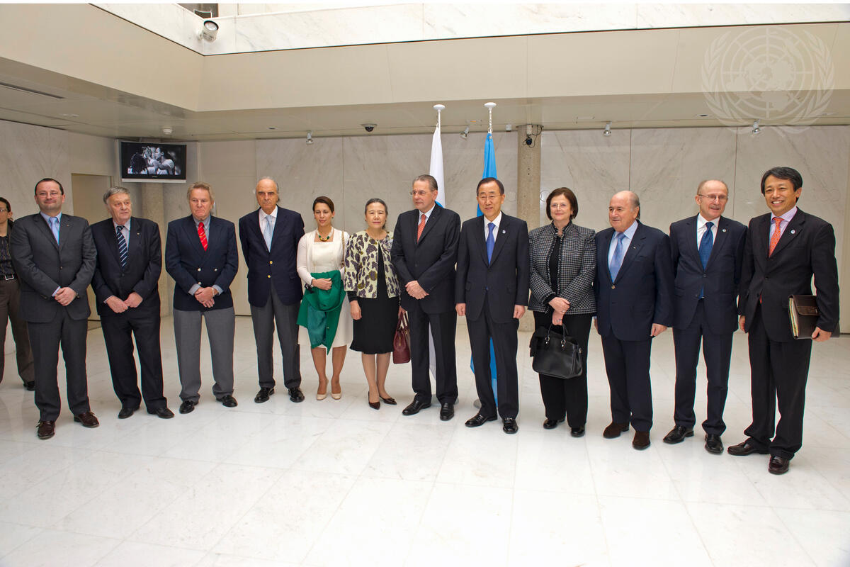 Secretary-General Ban Ki-moon (fifth from right); his wife, Yoo Soon-taek (sixth from left); and Kim Won-soo (right), his Deputy Chef de Cabinet; pose for a group photo with the members of the International Olympic Committee (IOC), including Committee President Jacques Rogge (left of Mr. Ban), at the IOC’s headquarters in Lausanne, Switzerland.
