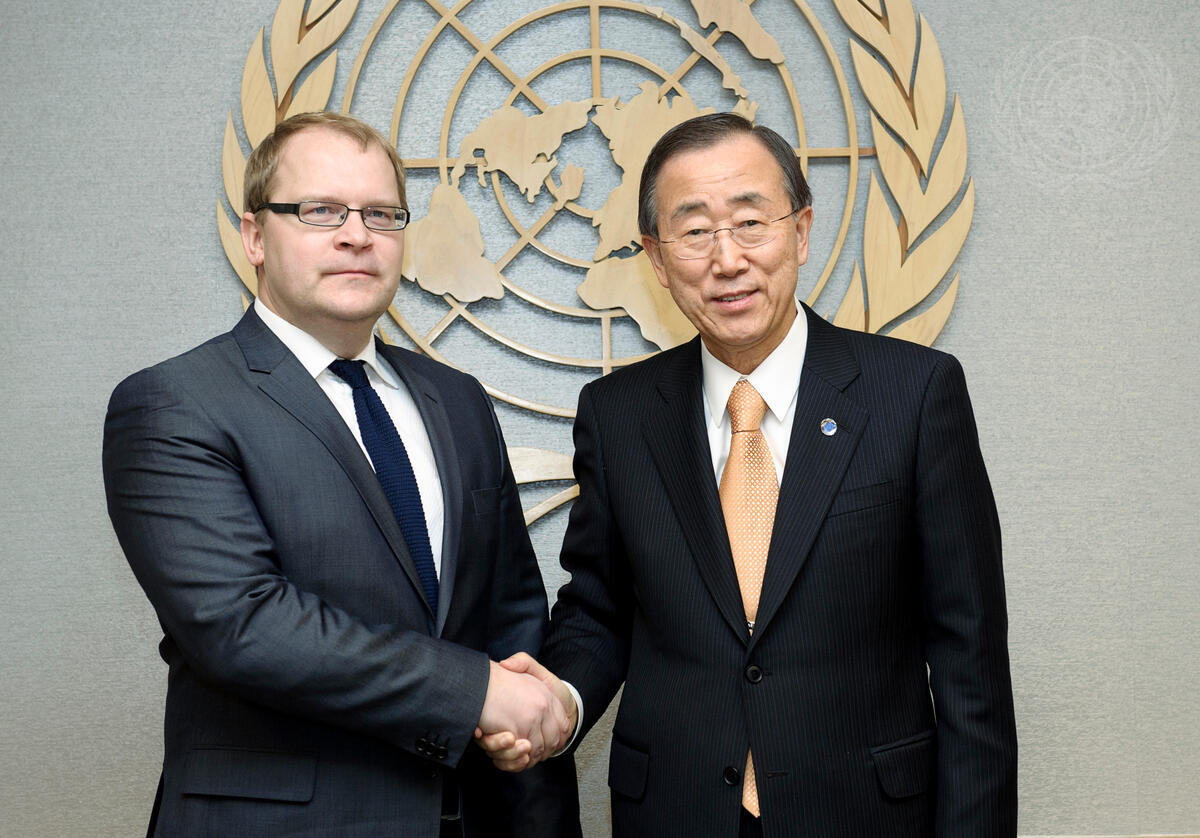 Secretary-General Ban Ki-moon (right) meets with Urmas Paet, Minister for Foreign Affairs of the Republic of Estonia.