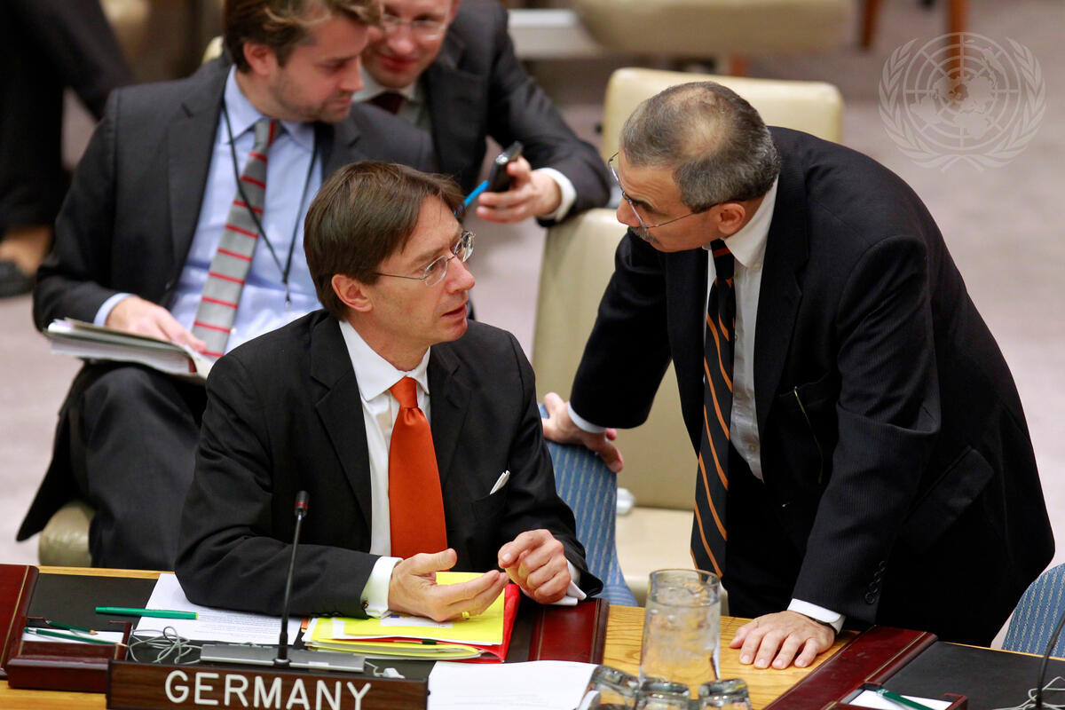 Peter Wittig (foreground, left), Permanent Representative of Germany to the UN, confers with Nawaf Salam, Permanent Representative of Lebanon to the UN, prior to the Security Council’s meeting on the situation on Libya.