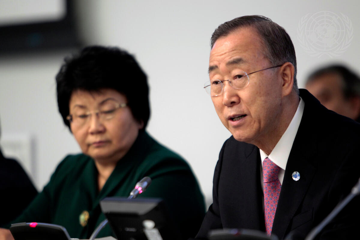 Secretary-General Ban Ki-moon (right) convenes a second high-level stakeholders meeting of the Peacebuilding Fund, attended by Roza Otunbaeva (next to Mr. Ban), President of Kyrgyzstan.