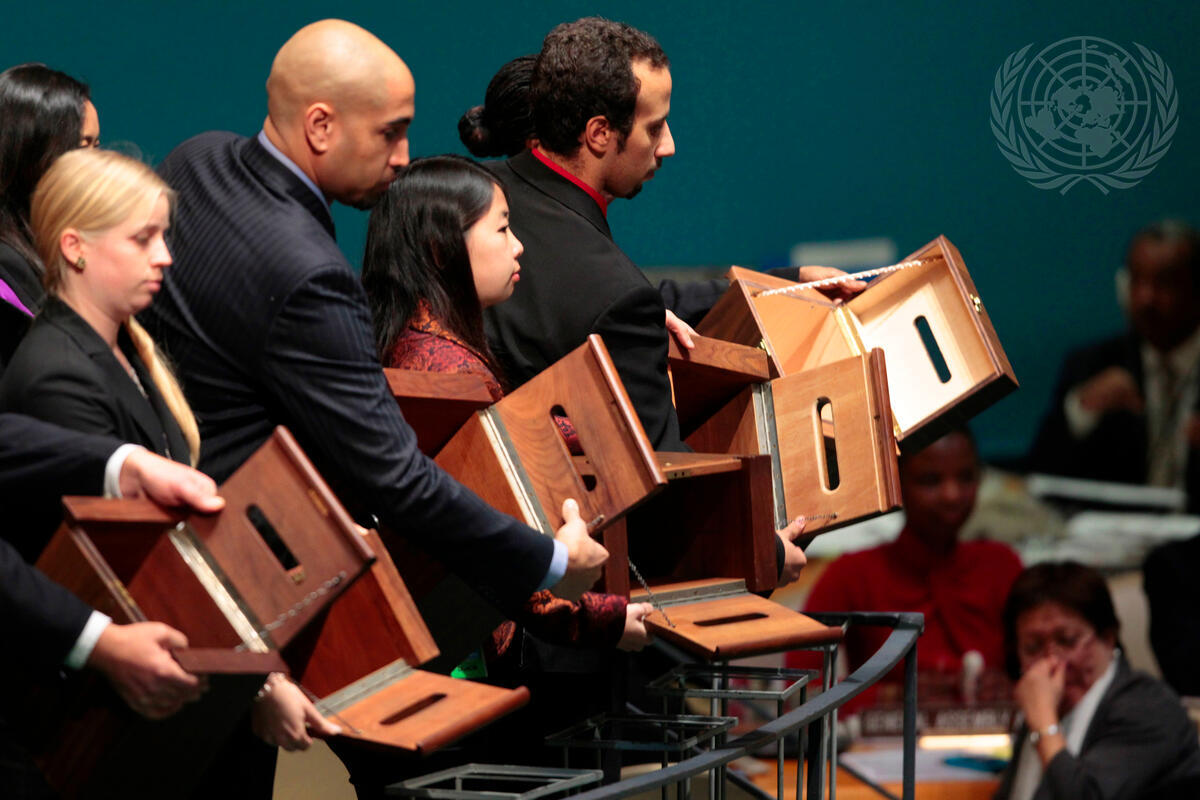 Conference Service support staff hold up empty ballot boxes before circulating them among Members of the General Assembly who will vote to fill a fifth and final vacancy on the International Court of Justice (ICJ). The Assembly had been deadlocked in previous rounds of voting held concurrently with the Security Council nearly two weeks ago, and failed to choose between candidates from Sierra Leone and Uganda for the final seat on the Court.