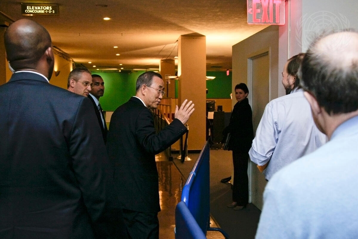 Secretary-General Ban Ki-moon (centre) concludes his remarks to journalists on the news today that Yemeni President Ali Abdullah Saleh has signed an agreement to hand over power to his vice-president, Abdrabuh Mansour Hadi Mansour, after months of protests in that country. Mr. Ban said he urged Mr. Saleh by telephone yesterday to sign the power-transfer deal, an initiative of the Gulf Cooperation Council (GCC) assisted by UN Special Envoy Jamal Benomar, and that he was encouraged by the move.