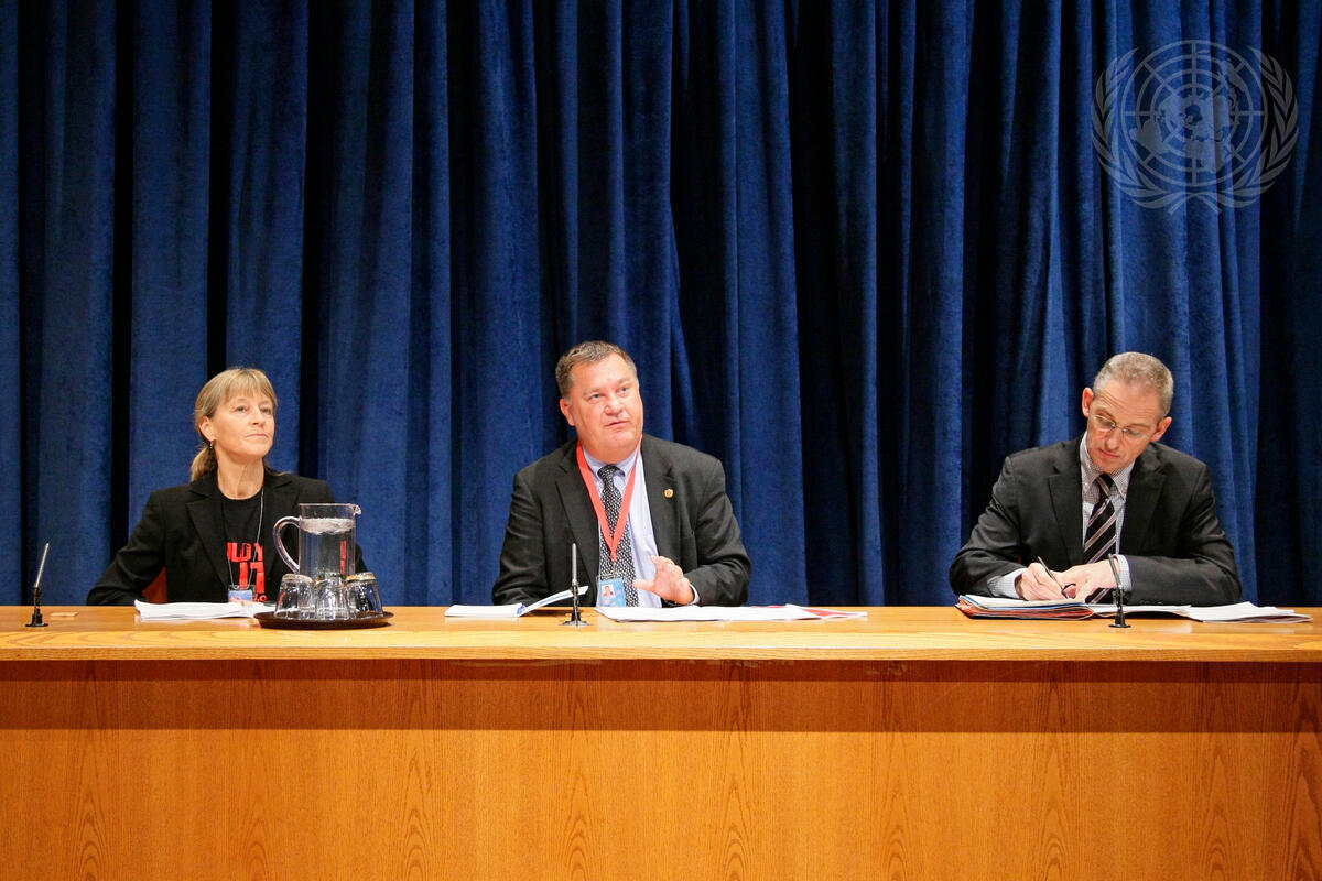Bertil Lindblad (centre), Director of the New York Office of the Joint United Nations Programme on HIV/AIDS (UNAIDS), briefs correspondents on the organization’s report suggesting 2011 is a “critical turning point"" in the fight against AIDS, with new HIV infection rates this year at their lowest since the height of the epidemic in 1997. He is pictured with Kim Nichols (left), Co-Executive Director of the African Services Committee, and Martin Nesirky, Spokesperson for the Secretary-General.