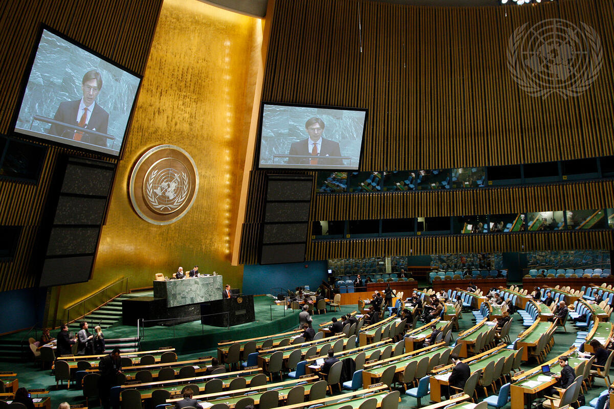 A wide view of the General Assembly as Peter Wittig (on screens), Permanent Representative of Germany to the UN, presents a draft resolution, adopted by consensus, pledging the Assembly’s support for a “stable, secure, economically self-sufficient” Afghanistan, at the Assembly’s annual meeting on the country.