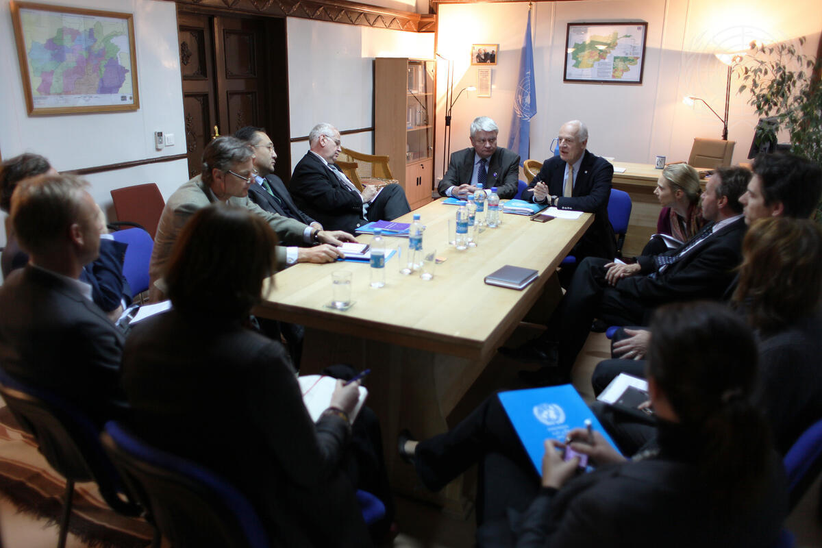 Hervé Ladsous (head of table, left), Under-Secretary-General for Peacekeeping Operations, meets with Staffan de Mistura (next to Mr. Ladsous), Special Representative of the Secretary-General and Head of the UN Assistance Mission in Afghanistan (UNAMA), and UNAMA staff members in Kabul.