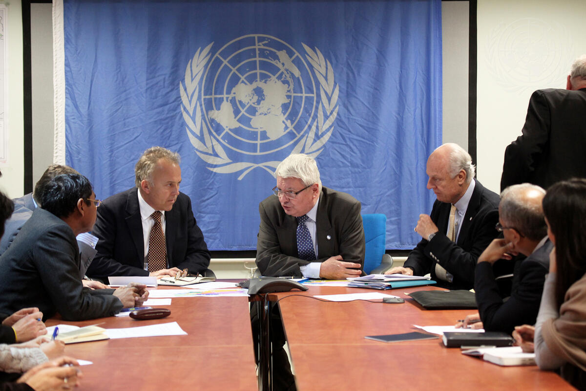 Hervé Ladsous (second from right), Under-Secretary-General for Peacekeeping Operations, speaks with senior staff members of the UN Assistance Mission in Afghanistan (UNAMA), including Head of Mission Staffan de Mistura (right), at the UNAMA offices in Kabul.