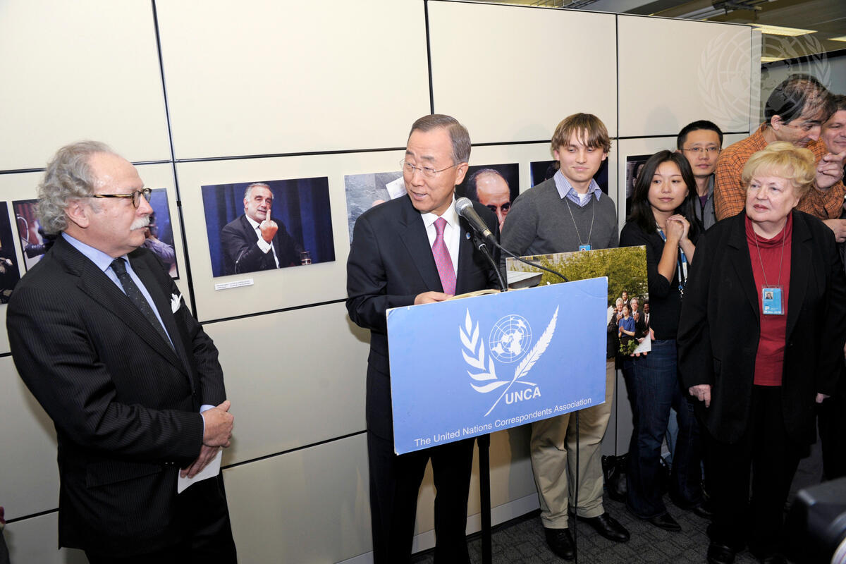 Secretary-General Ban Ki-moon (at podium) speaks at the opening of the photo exhibit organized by the UN Correspondents’ Association (UNCA), alongside UNCA President Giampaolo Pioli (left).