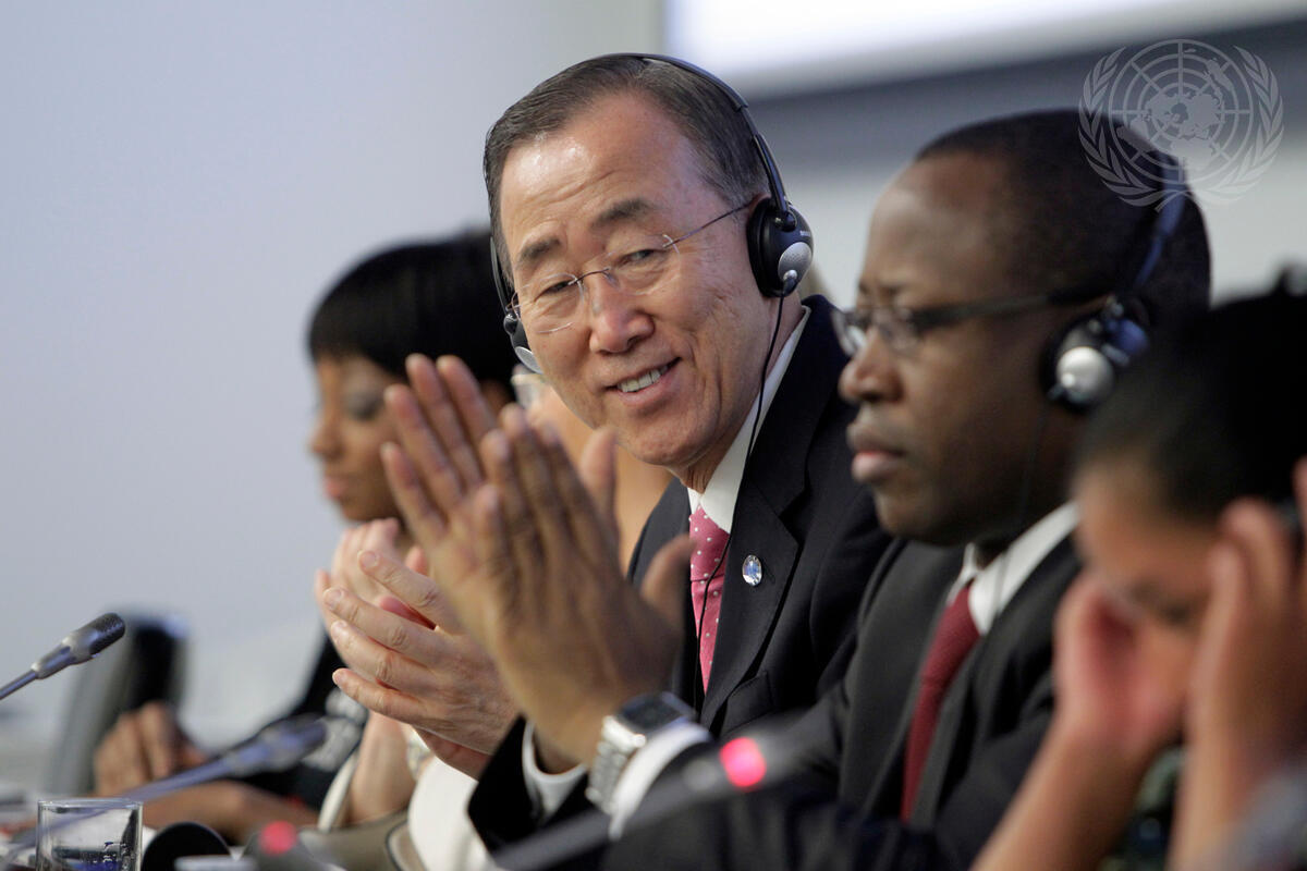 Secretary-General Ban Ki-moon (centre) applauds with fellow panellists during a special event commemorating the International Day for the Elimination of Violence against Women and the 15th Anniversary of the UN Trust Fund to End Violence against Women.