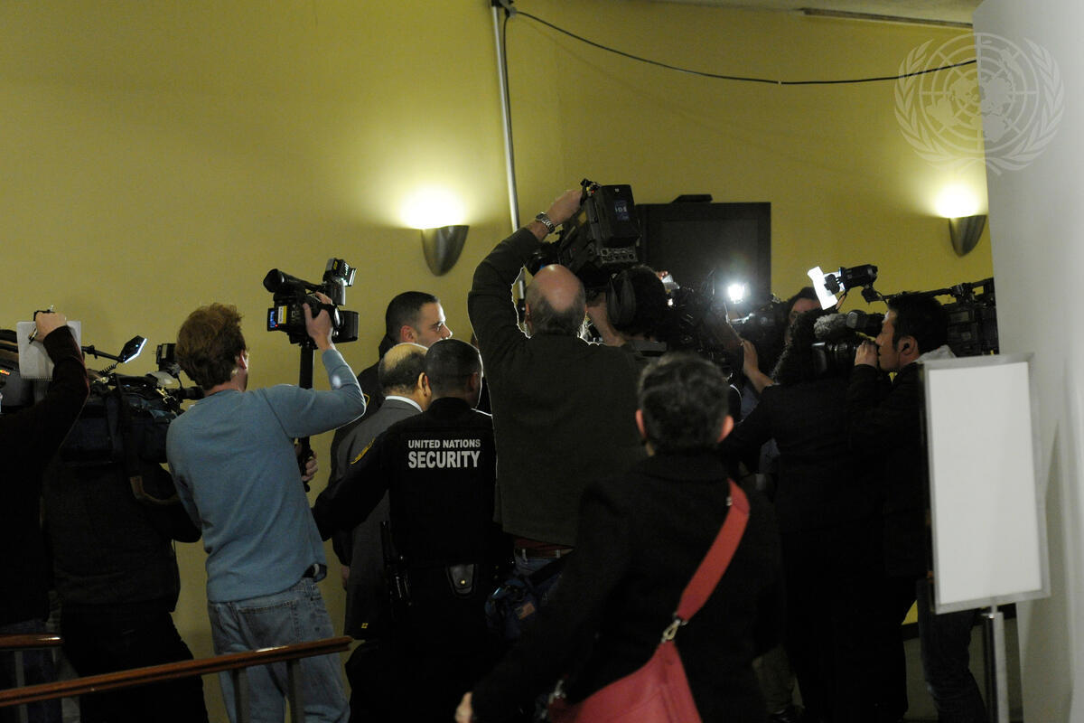 Reporters crowd into the stakeout are outside the Security Council Chamber following the Council’s meeting on the crisis in Libya. Deadly government attacks against masses of protesters began in the country over one week ago.