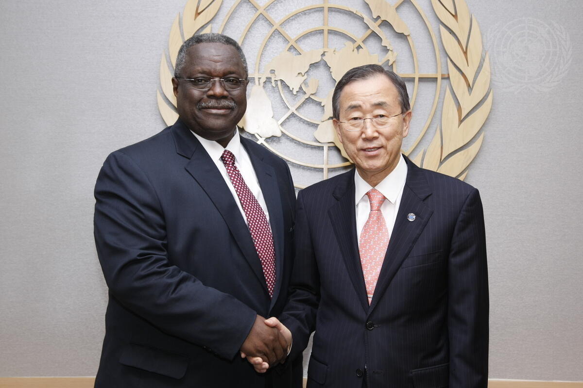 Secretary-General Ban Ki-moon (right) meets with Leslie Kojo Christian, Permanent Representative of Ghana to the United Nations.