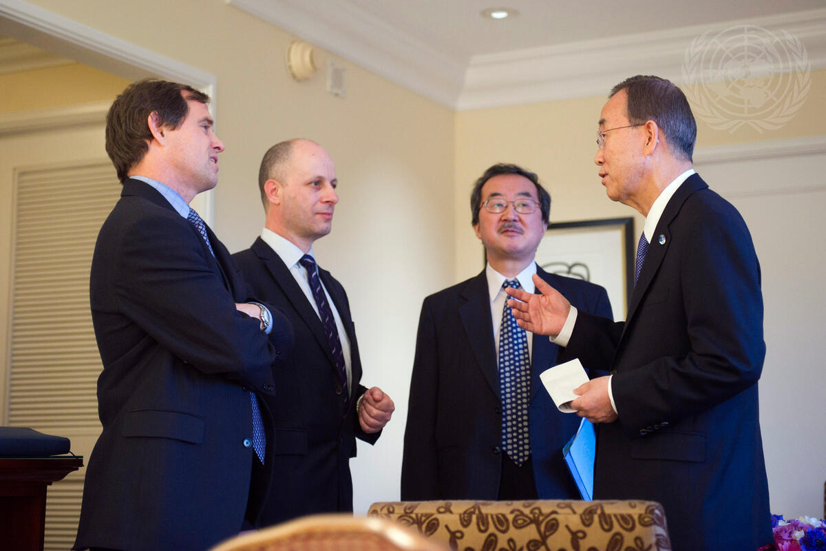 Secretary-General Ban Ki-moon (right) speaks with his senior advisers in Los Angeles, California, before delivering a statement to the press on the situation in Libya, where mass protests have been met by a violent government crackdown. Pictured, from left: Robert Orr, Assistant Secretary-General for Policy Planning; Maher Nasser, Director of the Outreach Division at the UN Department Public Information; and Kiyotaka Akasaka, Under-Secretary-General for Communications and Public Information.
