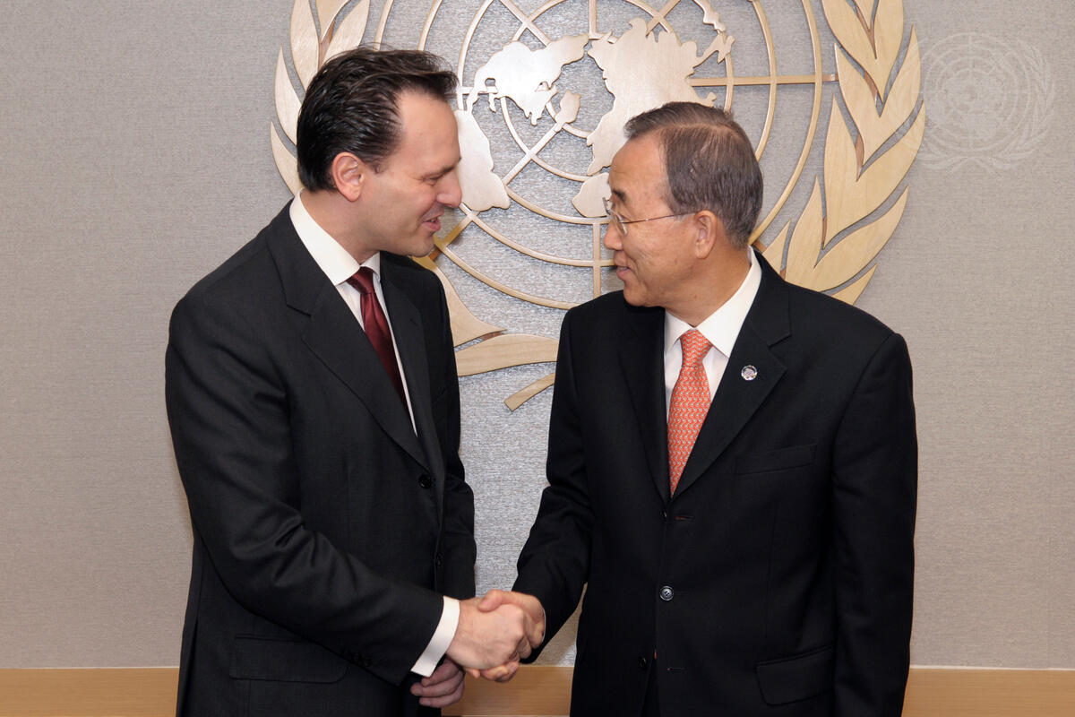Secretary-General Ban Ki-moon (right) meets with Dimitris Droutsas, Minister for Foreign Affairs of Greece.