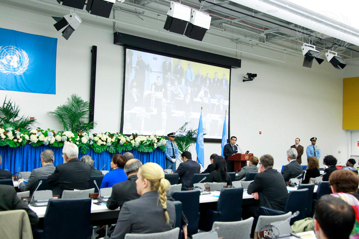 A wide view of the memorial service honouring UN staff members fallen in the line of duty over the past year and a half, as Nassir Abdulaziz Al-Nasser (at podium), President of the sixty-sixth session of the General Assembly, addresses the service.