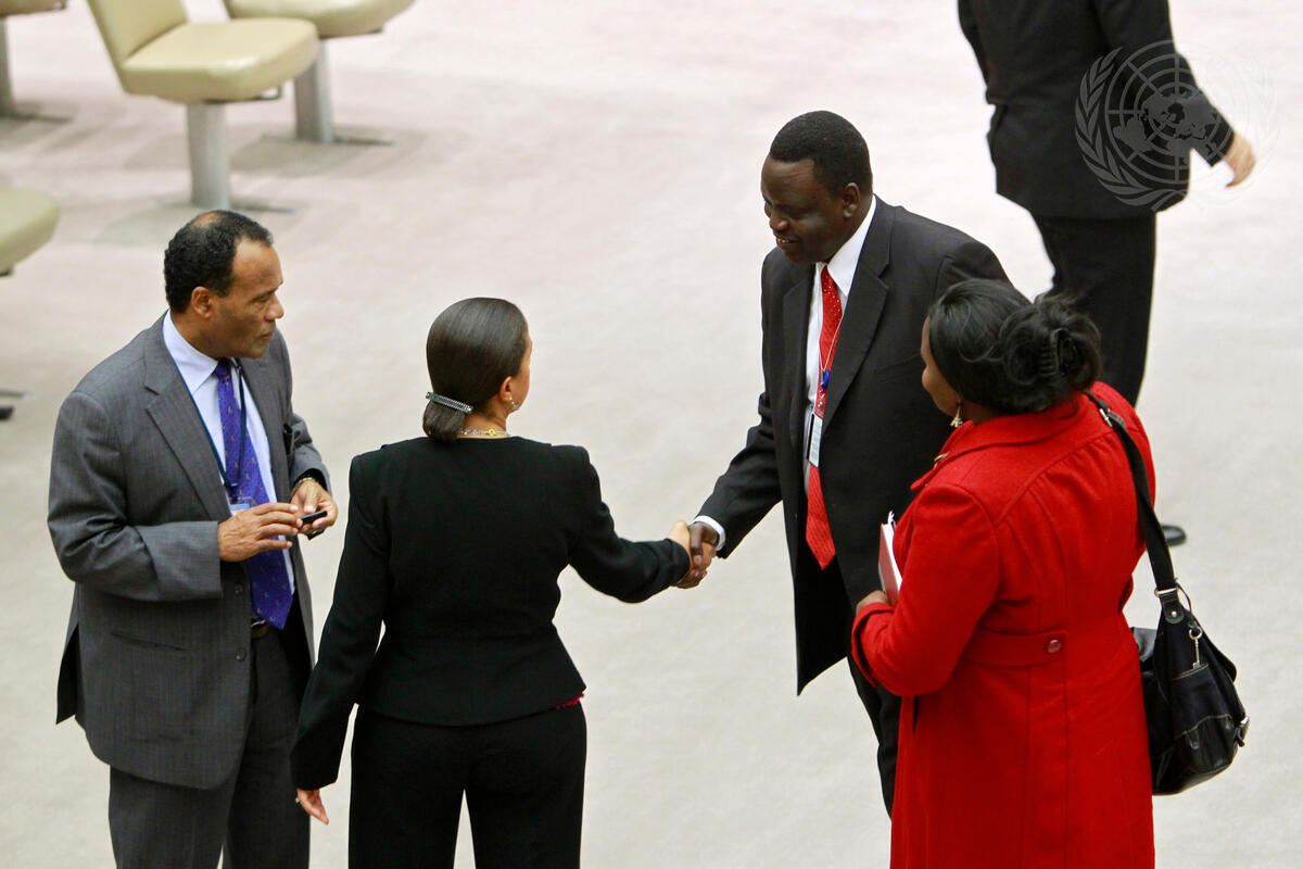 Susan E. Rice (front, centre), Permanent Representative of the United States to the UN, greets David Buom Choat, Acting Permanent Representative of South Sudan to the UN, before a meeting of the Security Council on Sudan and South Sudan.