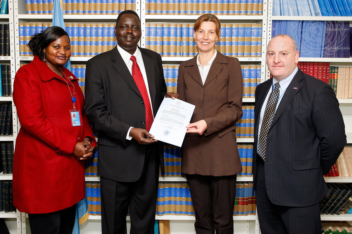 David Buom Choat (second from left), Acting Permanent Representative of South Sudan to the UN, deposits a notification of succession to the Anti-Personnel Mine Ban Convention, or Ottawa Convention, on behalf of his newly independent nation. Pictured with Mr. Choat, from left: Agnes Oswaha, Acting Deputy Permanent Representative of South Sudan to the UN; Gabriele Goettsche-Wanli, Chief of the Treaty Section in the UN Office of Legal Affairs (OLA); and Justin Brady, Acting Director of the UN Mine Action Service (UNMAS).