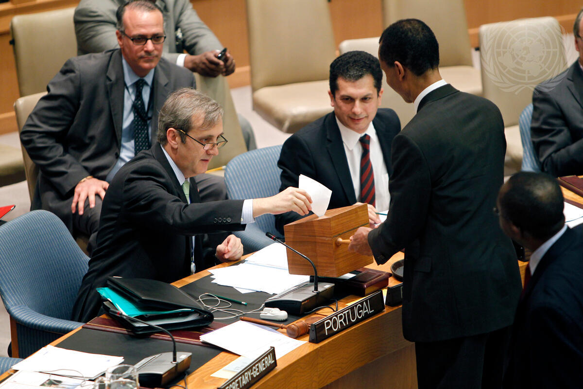 João Maria Cabral (left), Deputy Permanent Representative of Portugal to the UN and President of the Security Council, casts his ballot in one of the Council’s several rounds of voting, held concurrently with the General Assembly, to elect a fifth and final member of the International Court of Justice (ICJ). In earlier rounds the Council elected four ICJ members from China, Italy, Japan and Slovakia.