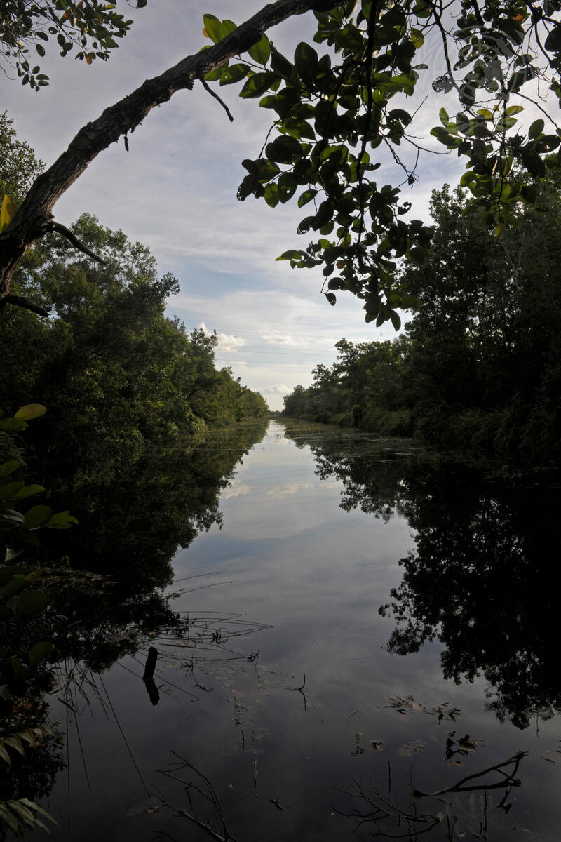 Canals in Palangkaraya in Central Kalimantan Province, Indonesia, are hedged by dams to retain water for the regeneration of peat fields.
