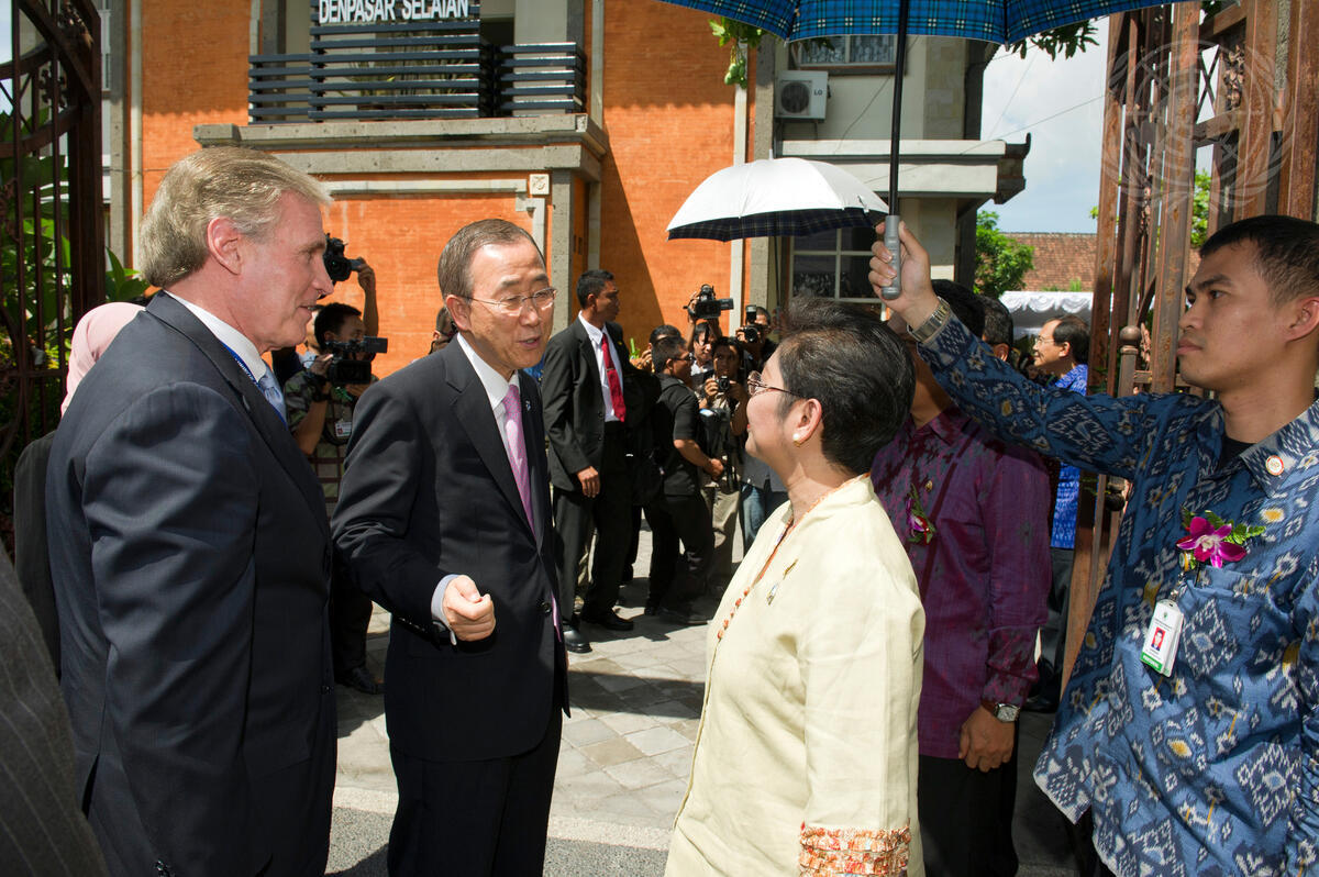 Secretary-General Ban Ki-moon (centre) and Ray Chambers (left), his Special Envoy for Malaria, meet the director of a local health centre in Bali, Indonesia. The visit to the centre is part of Mr. Ban’s three-nation Southeast Asian tour of women’s and children’s health facilities.