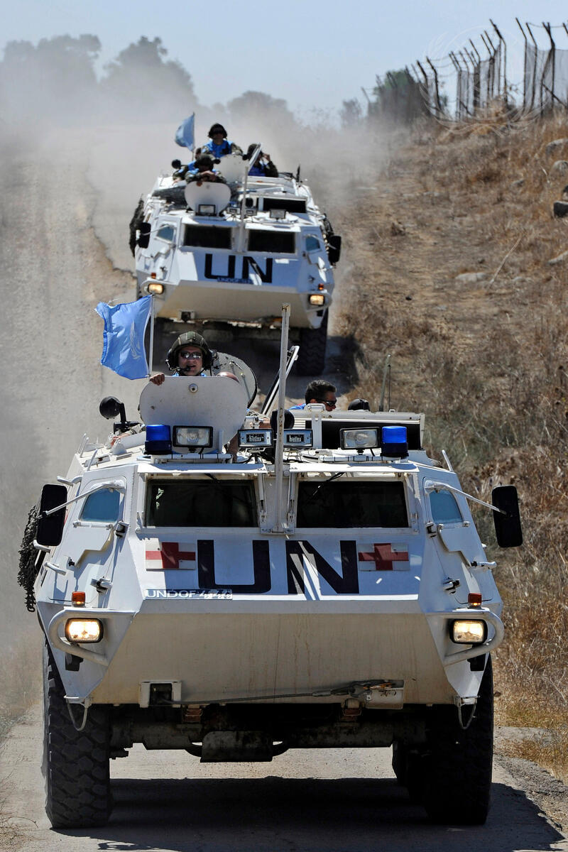 Peacekeepers of the UN Disengagement Observer Force (UNDOF) patrol the Golan Heights between Syria and Israel, near UNDOF’s headquarters at Camp Faouar, Syria.