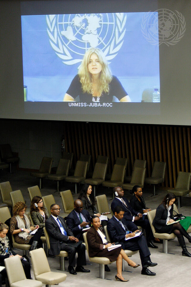 A view inside the Security Council chamber as Hilde Johnson (on screen), Special Representative of the Secretary-General and Head of the UN Mission in the Republic of South Sudan (UNMISS), speaking via videolink from that country, briefs the Council.