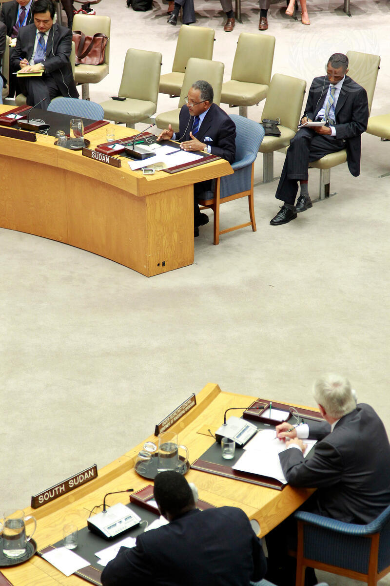 Daffa-Alla Elhag Ali Osman (top), Permanent Representative of the Republic of Sudan, addresses a meeting of the Security Council on the situation in South Sudan, as David Buom Choat (below, left), Acting Permanent Representative of South Sudan to the UN, and Hervé Ladsous (next to Mr. Choat), Under-Secretary-General for Peacekeeping Operations, listen.