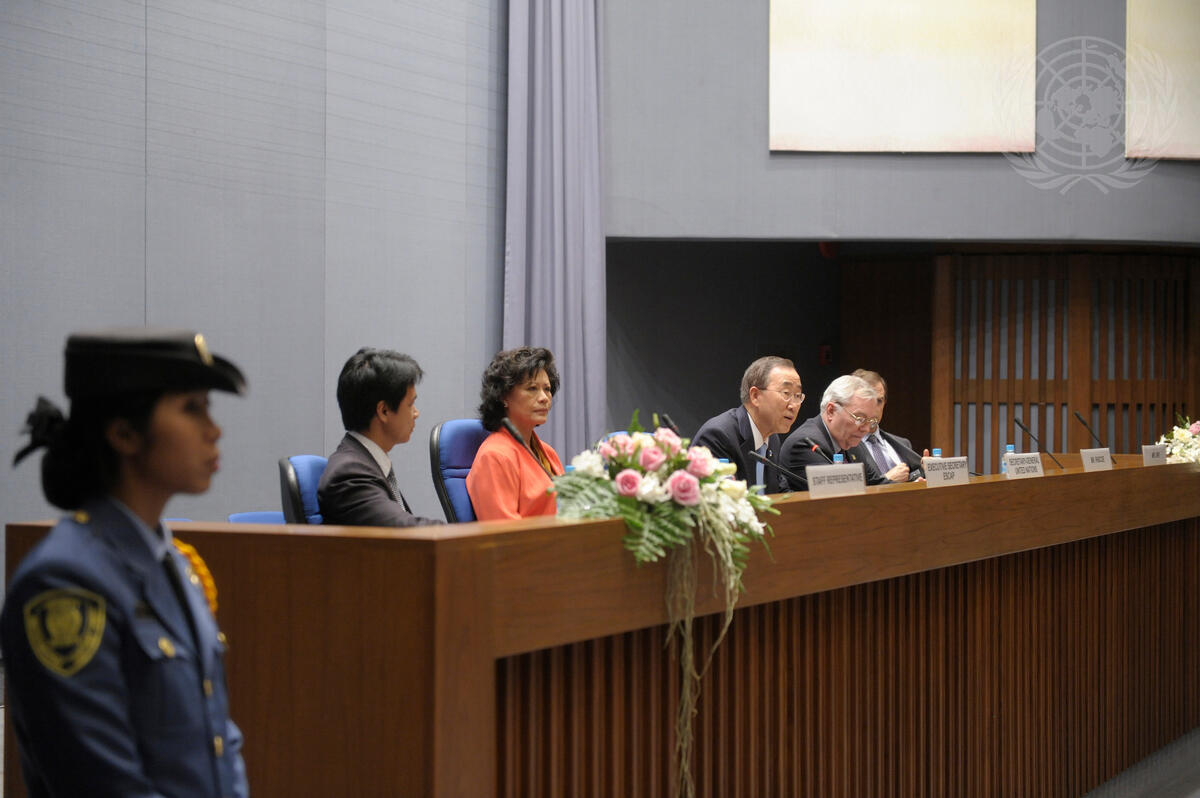 Secretary-General Ban Ki-moon (at podium, third from left) addresses Thailand-based staff members at the UN offices in Bangkok. Mr. Ban is flanked by Noeleen Heyzer (left), Executive Secretary of the UN Economic and Social Commission for Asia and the Pacific (ESCAP), and B. Lynn Pascoe, Under-Secretary-General for Political Affairs.