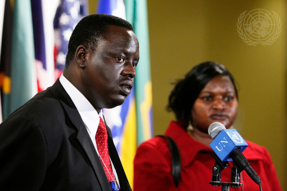 David Buom Choat, Acting Permanent Representative of South Sudan to the UN, briefs correspondents following a meeting of the Security Council on his country and its relations with neighbouring Sudan.
