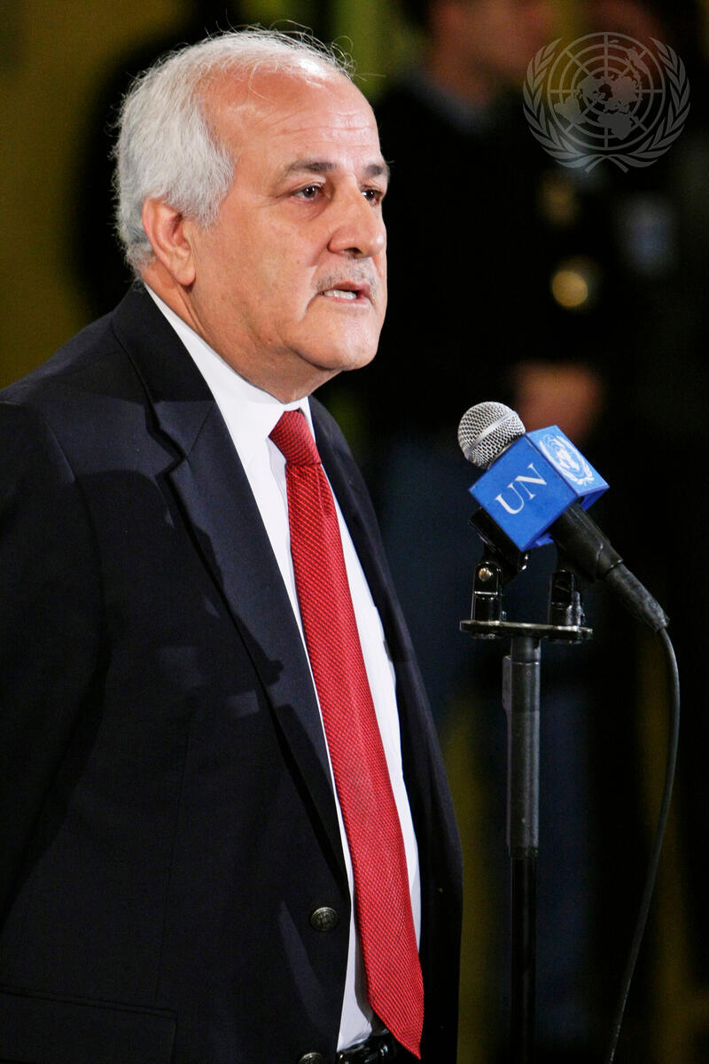 Riyad H. Mansour, Permanent Observer of Palestine to the UN, speaks to the press on the report adopted by the Security Council’s admissions committee regarding the Palestinian request for full UN membership. The report has been passed to the Council for consideration.