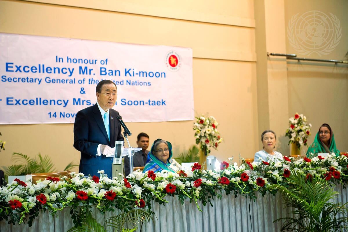 Secretary-General Ban Ki-moon speaks at the state dinner in Dhaka, Bangladesh, hosted in his honour by Bangladeshi Prime Minister Sheikh Hasina (seated right of Mr. Ban). Also pictured are Dipu Moni (right), Minister for Foreign Affairs of Bangladesh, and Mr. Ban’s wife, Yoo Soon-taek (second from right).