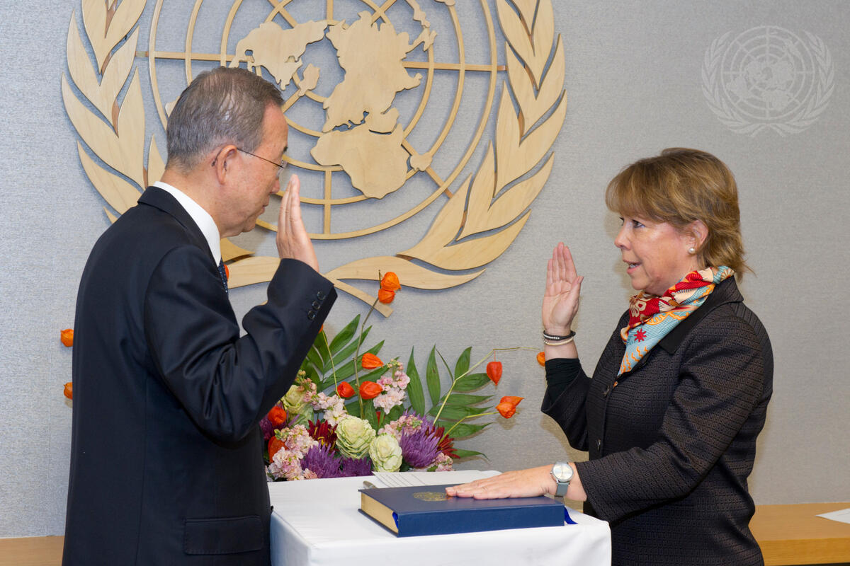 Secretary-General Ban Ki-moon (left) administers the oath of office to María Eugenia Casar, new Assistant Secretary-General for the Office of Programme Planning, Budgets and Accounts, and United Nations Controller.