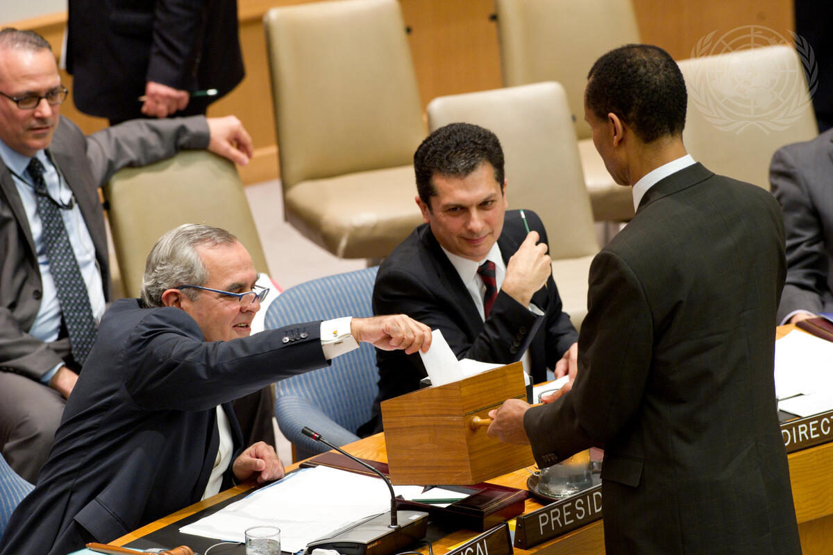 José Filipe Moraes Cabral (left), Permanent Representative of Portugal to the UN and President of the Security Council for November, casts his ballot in the Council’s election of five members of the International Court of Justice (ICJ).