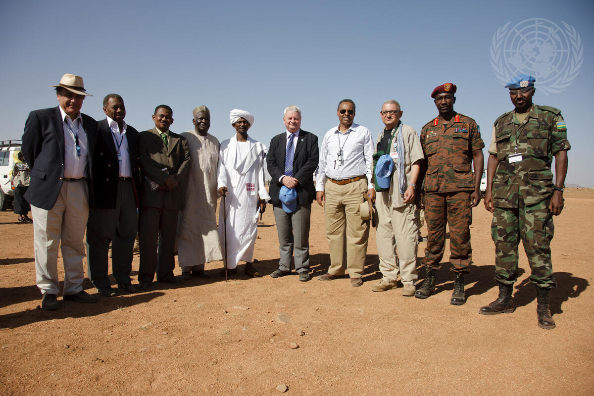 Hervé Ladsous (centre), Under-Secretary-General for Peacekeeping Operations, poses for a group photo with a delegation of the African Union-United Nations Hybrid Operation in Darfur (UNAMID), including Joint Special Representative Ibrahim Gambari (fourth from left), and Deputy Representative Mohamed Yonis (right of Mr. Ladsous), during their visit to Shangil Tobaya village, 65 km south of El Fasher, North Darfur.