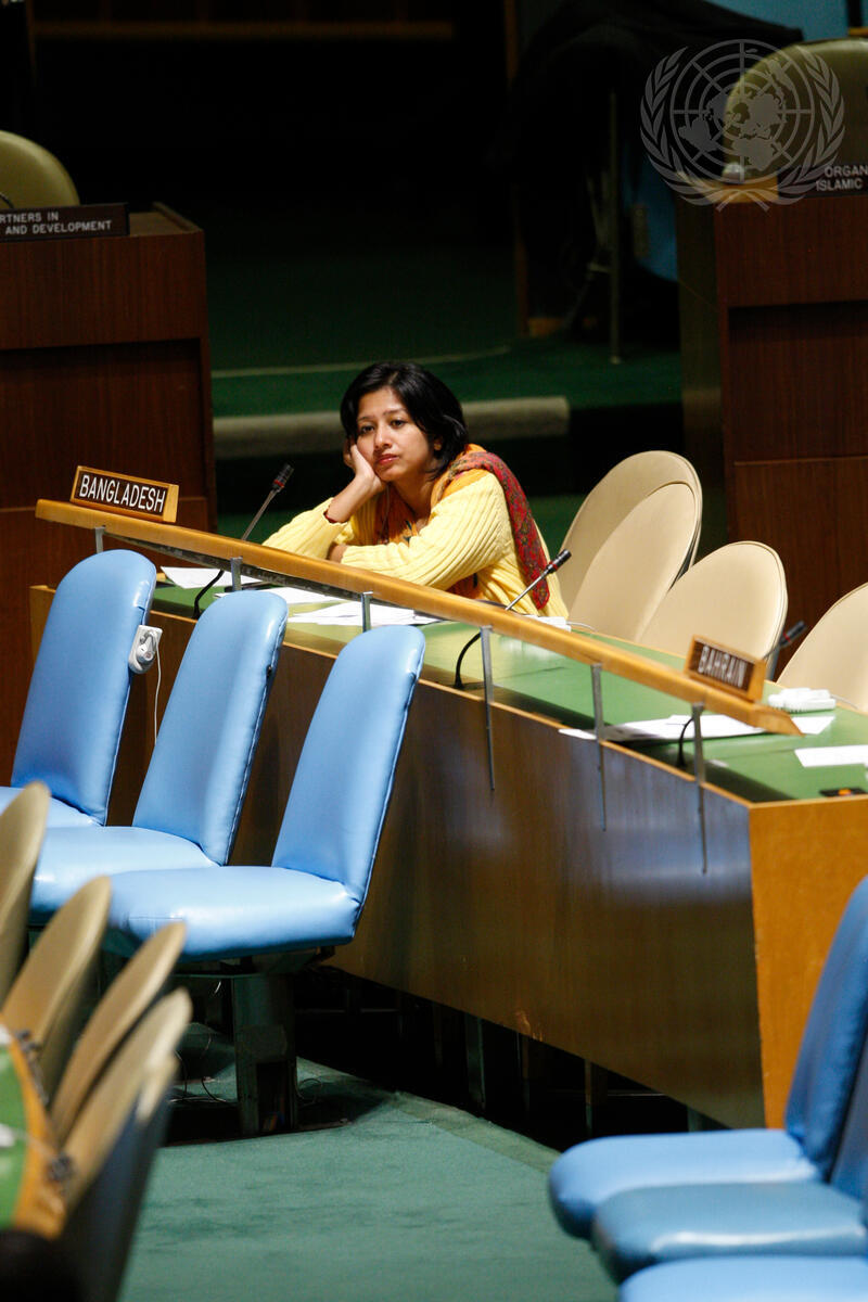 A delegate from Bangladesh, pictured in the General Assembly Hall, as the Assembly continues its consideration of the annual report of the International Atomic Energy Agency (IAEA) and of a draft resolution reaffirming support for the Agency.