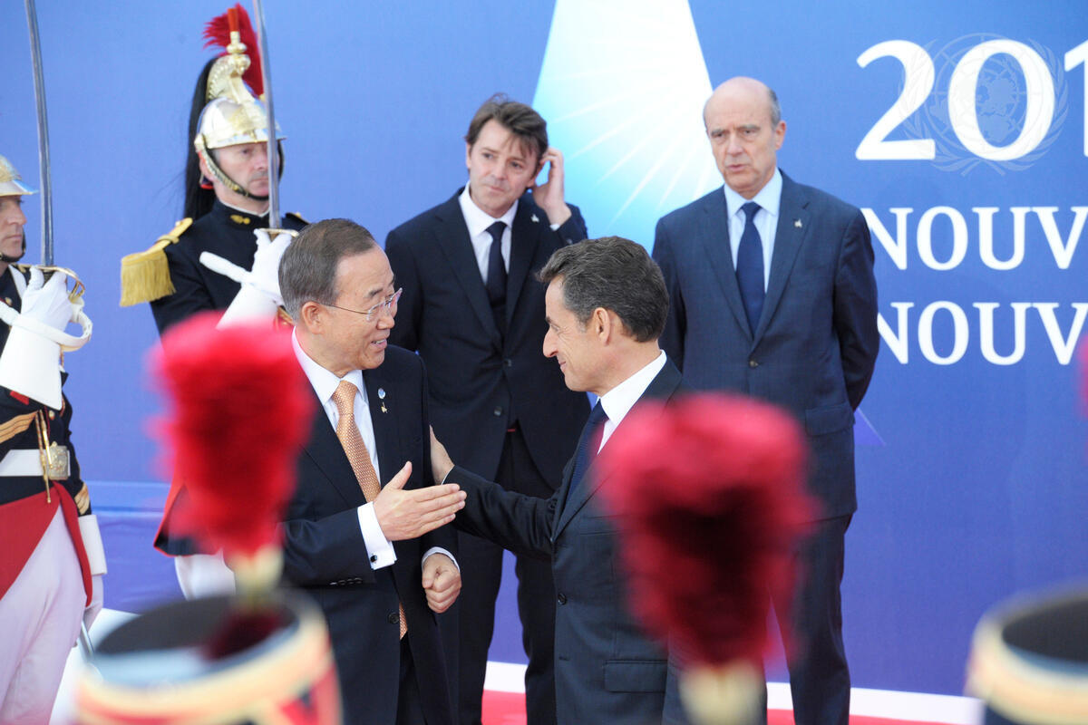 Secretary-General Ban Ki-moon (front, left) is greeted by French President Nicolas Sarkozy as he arrives at the summit of the Group of 20 (G20) major economies in Cannes, France. Pictured at right is Alain Juppé, France’s Minister for Foreign Affairs.