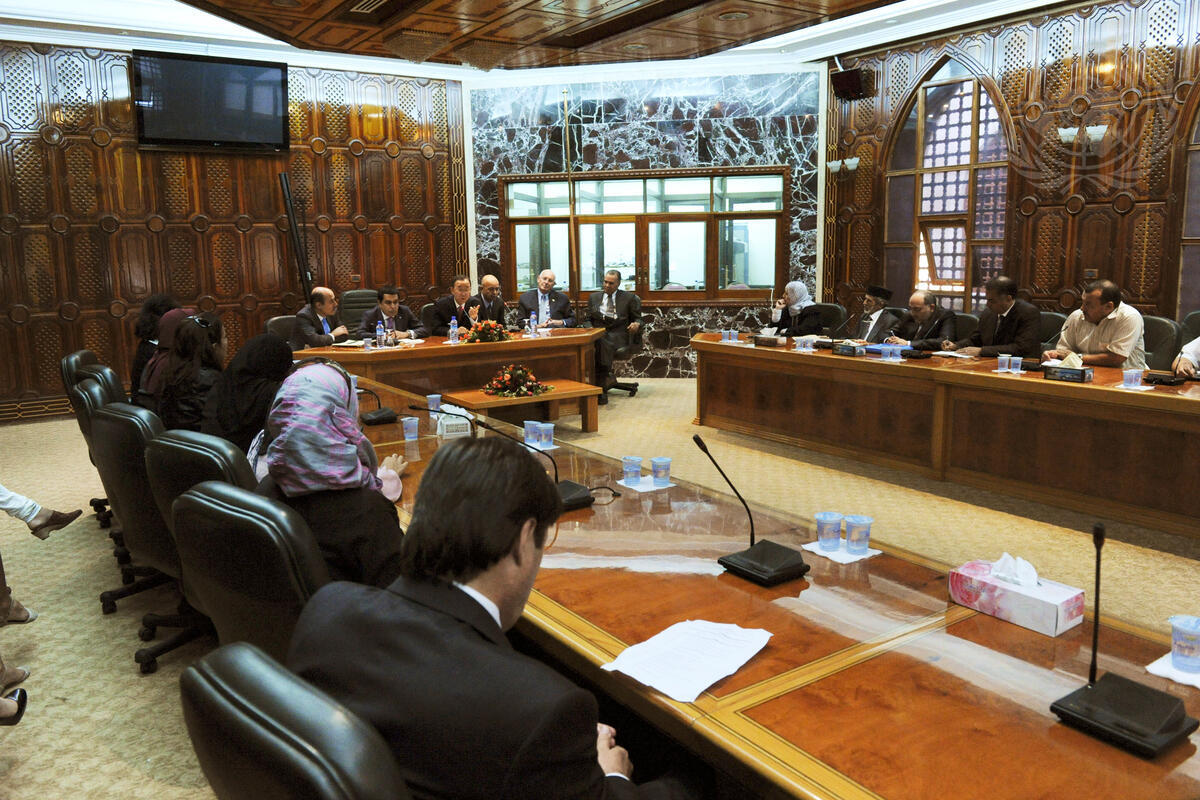 A wide view of a roundtable discussion between Secretary-General Ban Ki-moon (head table, centre), General Assembly President Nassir Abdulaziz Al-Nasser (left of Mr. Ban) and members of Libyan civil society at the Islamic University in Tripoli. With Mr. Ban is his Special Representative for Libya, Ian Martin (head table, right).