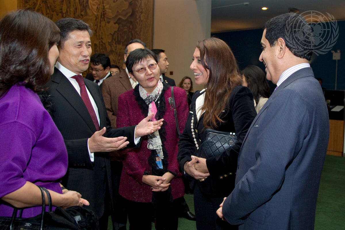 Nassir Abdulaziz Al-Nasser (right), President of the sixty-sixth session of the General Assembly, and his wife, Muna Ghassan Tamim Rihani (second from right), meet with Mongolian Prime Minister Batbold Sukhbaatar and Mongolia’s Permanent Representative to the UN, Enkhtsetseg Ochir, before the 2011 UN Day Concert at UN Headquarters, co-organized by the Permanent Mission of Mongolia and the UN Educational, Scientific and Cultural Organization (UNESCO).