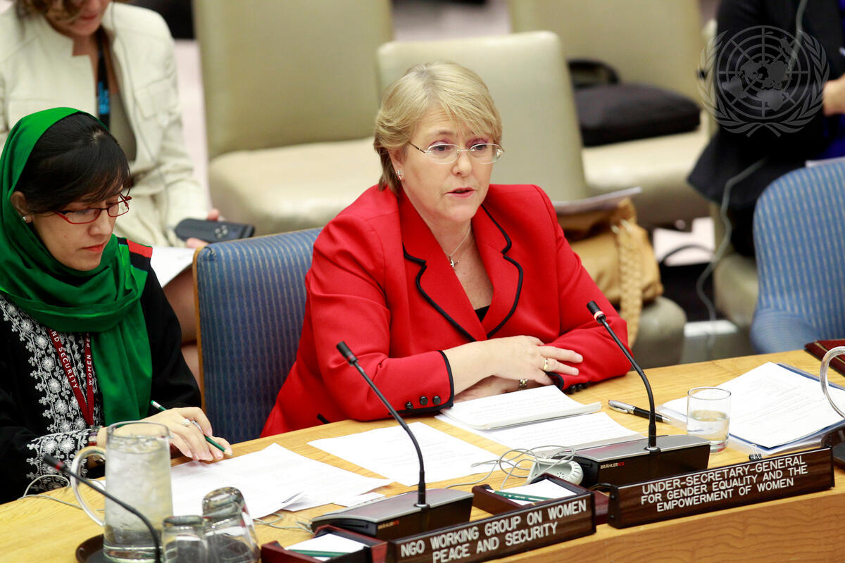 Michelle Bachelet (right), Executive Director of UN Women, addresses the Security Council on the role of women in peace and security, during the Council’s day-long debate marking the eleventh anniversary of landmark resolution 1325. At left is Orzala Ashraf Nemat (left) of the Non-Governmental Organization (NGO) Working Group on Women, Peace and Security.