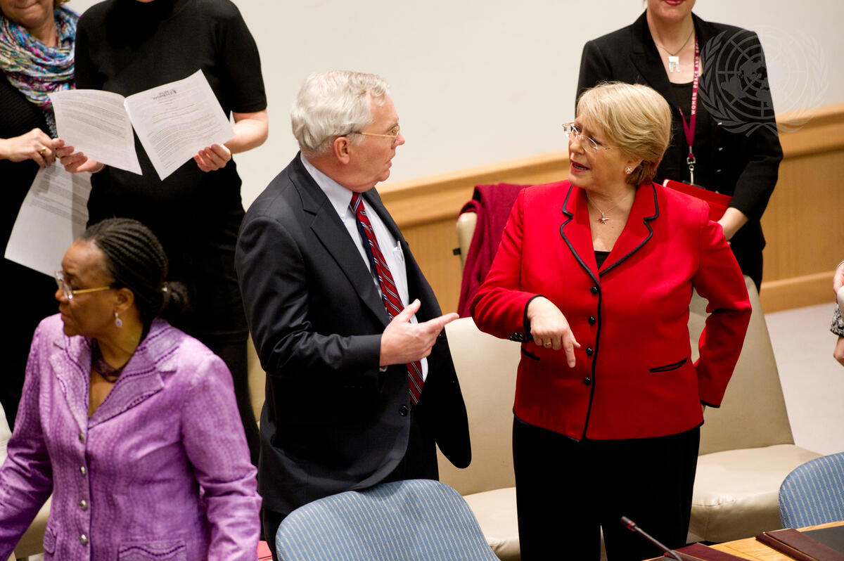 B. Lynn Pascoe (centre), Under-Secretary-General for Political Affairs, converses with Michelle Bachelet (right), Executive Director of UN Women, before the Security Council’s day-long debate marking the eleventh anniversary of its landmark resolution 1325 on the role of women in peace and security. At left is U. Joy Ogwu, Permanent Representative of Nigeria to the UN and President of the Security Council for October.