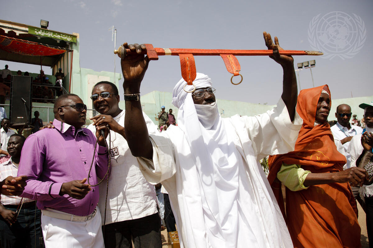 Audience members cheer at the UNAMID celebration of United Nations Day 2011. Special events included a performance by renowned Sudanese entertainer, Omer Ihsas, who sang a new song dedicated to peace in Darfur, and a military and police parade representing some of the many nationalities serving with the African Union/United Nations Hybrid operation in Darfur.
