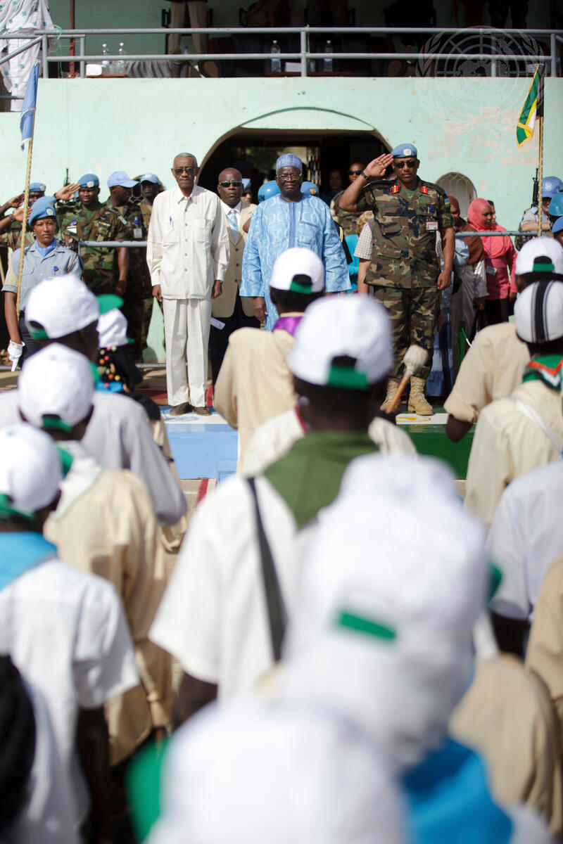 UNAMID Joint Special Representative, Ibrahim Gambari (centre) with the UNAMID Force Commander, Lieutenant General Patrick Nyamvumba (right) and a representative of the Government of Sudan (left) during a military and police parade for United Nations Day 2011, in El Fasher, Sudan.