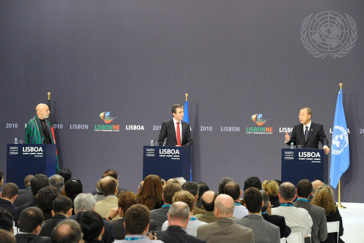 Secretary-General Ban Ki-moon (right) addresses a joint press conference with Anders Fogh Rasmussen (centre), Secretary General of the North Atlantic Treaty Organization (NATO), and Hamid Karzai, President of Afghanistan, following the NATO Summit’s meeting on Afghanistan in Lisbon, Portugal.