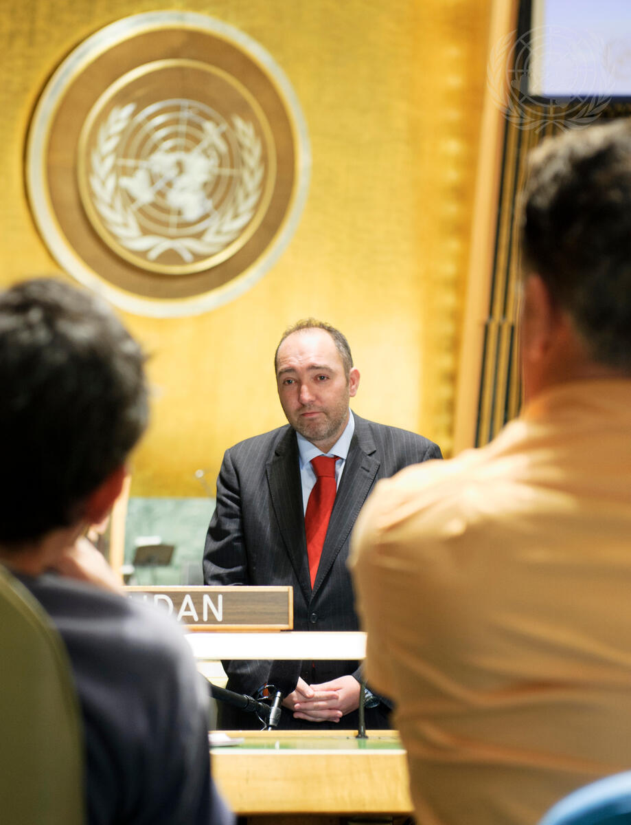 Natalio Grueso (centre), Director of the Centro Niemeyer, is interviewed by UNTV inside the General Assembly Hall. Mr. Grueso’s Centro Niemeyer is a member of the UN Academic Impact, an initiative launched by the Department of Public Information on 18 November.