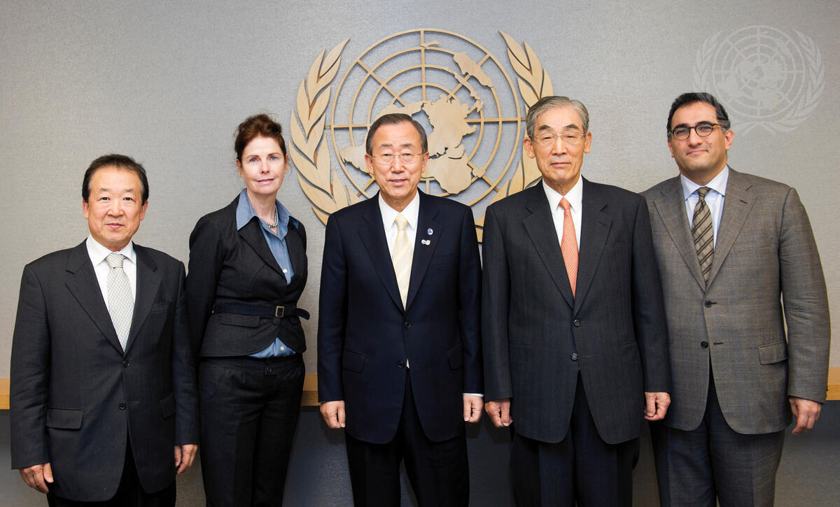 Secretary-General Ban Ki-moon (centre) meets with a delegation of the World Federation of United Nations Associations (WFUNA), including WFUNA President, Park Soo-gil (second from left). Also pictured, from left: Chang-boem Cho, Vice President of the UN Association of the Republic of Korea; Kathryn White, Chair of the WFUNA Executive Committee; and Bonian Golmohammadi, WFUNA Secretary-General.