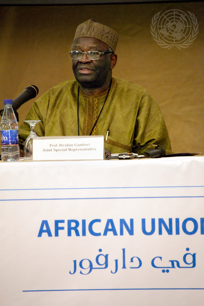 Ibrahim Gambari, Joint Special Representative for the African Union-United Nations Hybrid Operation in Darfur (UNAMID), holds a press conference at the Rotana Hotel in Khartoum, Sudan.