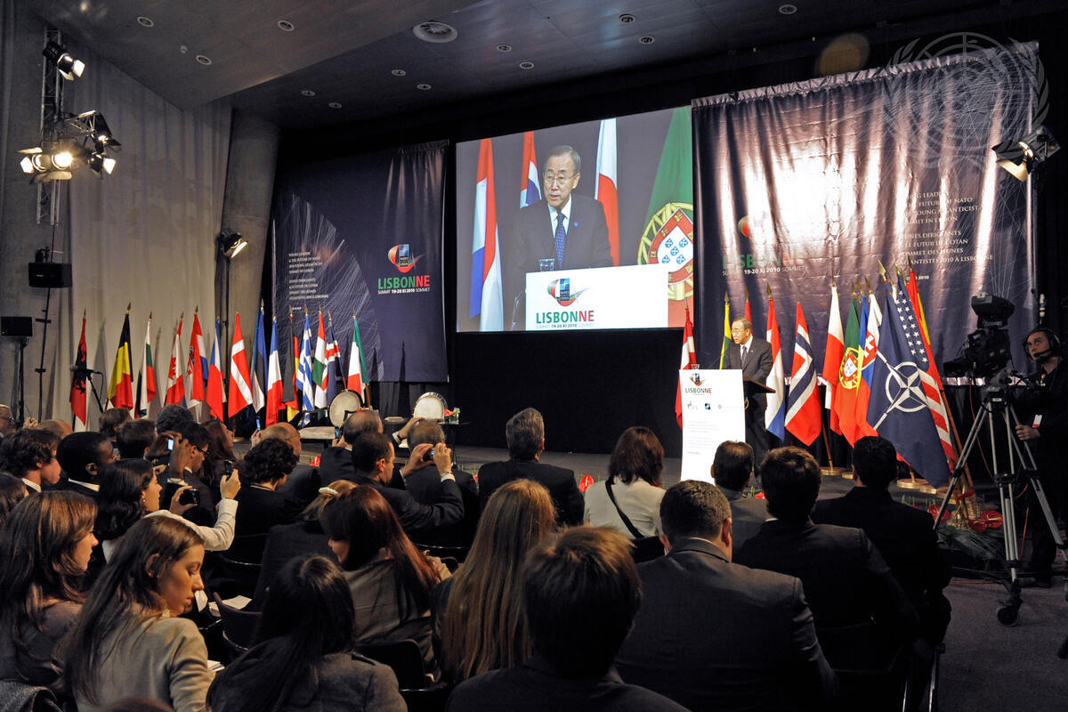 Secretary-General Ban Ki-moon addresses the 2010 Young Atlanticist Summit, a conference of youth leaders, held on the sidelines of the North Atlantic Treaty Organization (NATO) Summit in Lisbon, Portugal.